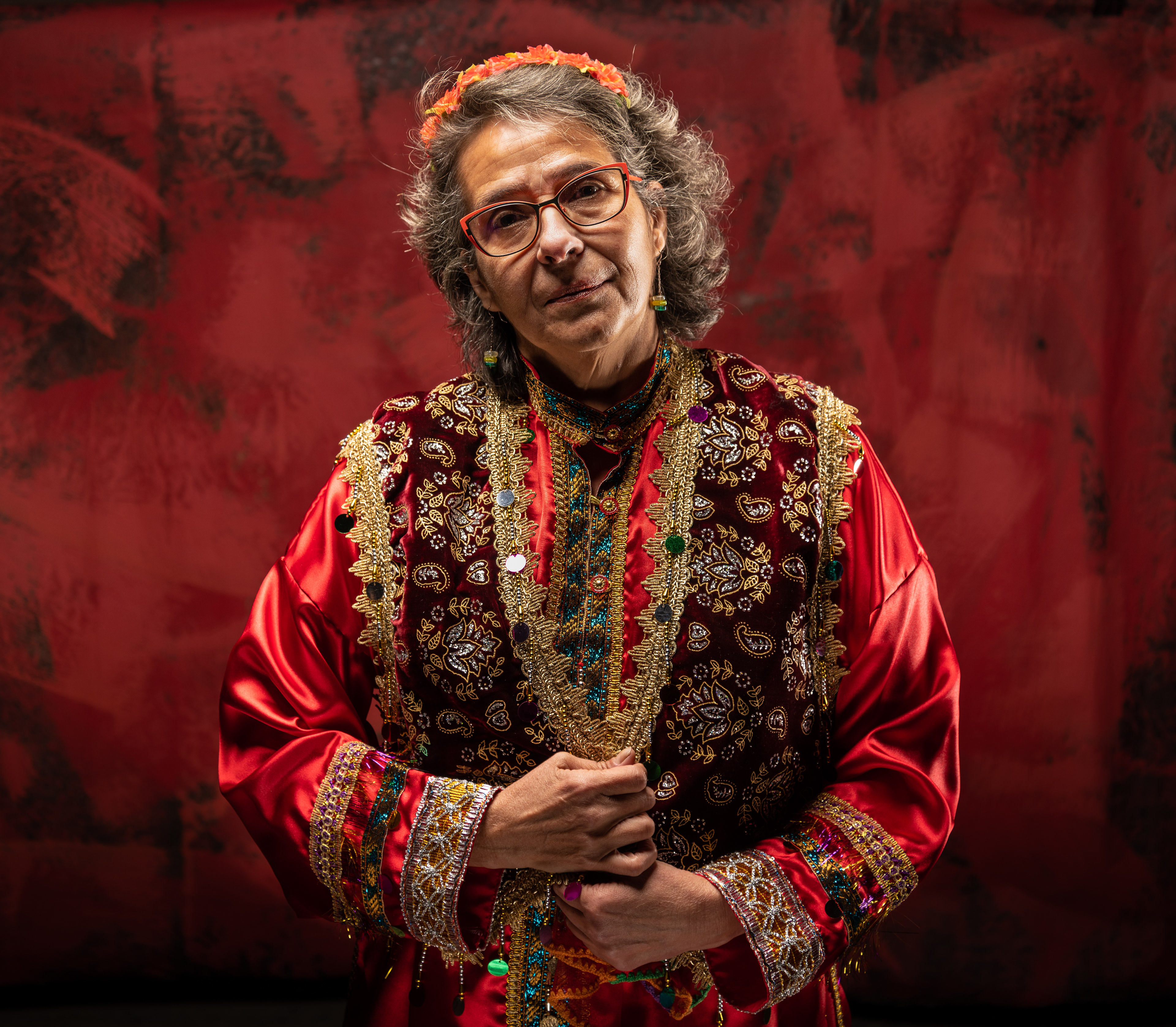 Portrait of Mahnaz wearing a traditional Persian dress.